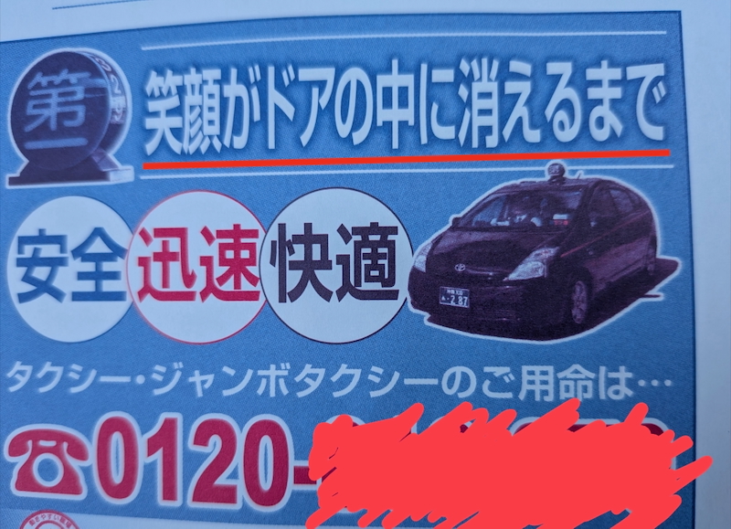 90年代ヒット曲でしょうか 2025年11月17日 テーマ: 看板&注意警告!, 街角VOW 作品の解説: 市役所でもらった封筒のタクシー広告。徳永英明やスピッツの歌詞にありそう。(茨城県/青海苔) 総本部長コメント: 「安全・迅速・快適」みたいな90年代の曲って……「LOVE LOVE LOVE」?(←いろいろちがいます)